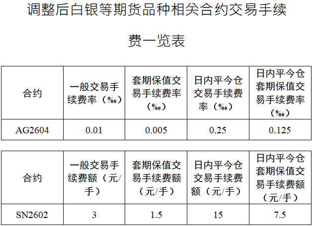 人民财讯1月7日电,上期所发布关于调整白银等期货品种相关合约交易手续费的通知。自2026年1月9日交易(即1月8日晚夜盘)起:白银期货AG2604合约日内平今仓交易手续费调整为成交金额的万分之二点五。锡期货SN2602合约日内平今仓交易手续费调整为15元/手。 实盘炒股配资